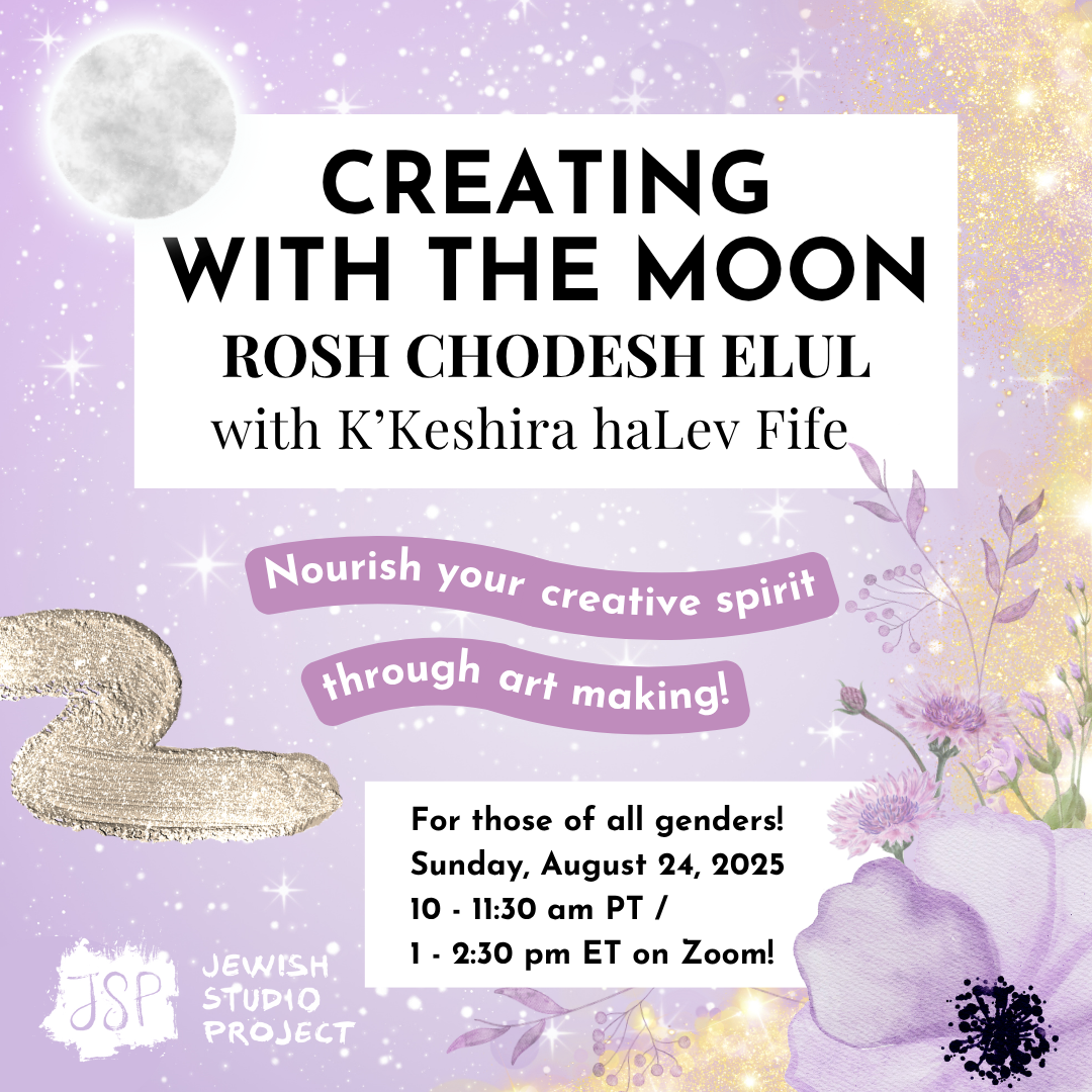 As the crescent moon becomes visible in the night sky, Rosh Chodesh offers you an opportunity to refresh your dreams and desires. In this session you’ll learn the fundamentals of the Jewish Studio Process, a unique methodology that builds creative capacity by combining art therapy practices with a reimagined approach to Jewish learning. Whether this is your first or fiftieth session, Creating With The Moon allows you to explore your creativity while deepening your connection to Jewish traditions.